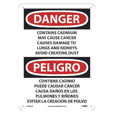 OSHA Sign ESD29. Legend: Danger Peligro Contains Cadmium May Cause Cancer Causes Damage To Lungs and Kidneys Avoid Creating Dust (bilingual)