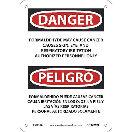 OSHA Sign ESD30. Legend: Danger Peligro Formaldehyde May Cause Cancer Causes Skin, Eye, and Respiratory Irritation Authorized Personnel Only (bilingual)