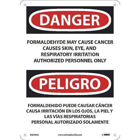 OSHA Sign ESD30. Legend: Danger Peligro Formaldehyde May Cause Cancer Causes Skin, Eye, and Respiratory Irritation Authorized Personnel Only (bilingual)
