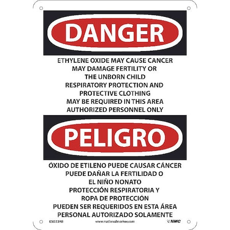 OSHA Sign ESD33. Legend: Danger Peligro Ethylene Oxide May Cause Cancer May Damage Fertility Or The Unborn Child Respiratory . . . Area Authorized Personnel Only (bilingual)