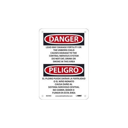 OSHA Sign ESD36. Legend: Peligro Lead May Damage Fertility Or The Unborn Child Causes Damage To The Central Nervous System Do Not Eat, Drink Or Smoke In This Area (bilingual)