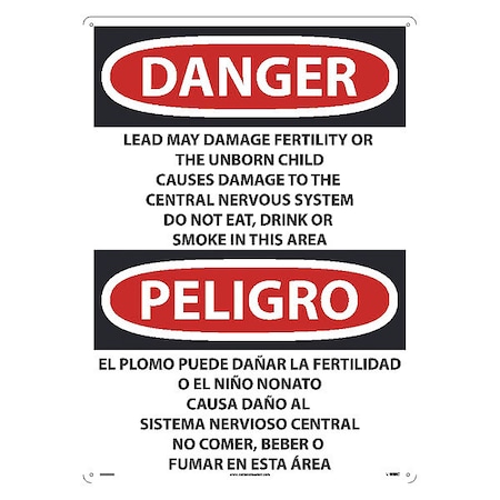 OSHA Sign ESD36. Legend: Peligro Lead May Damage Fertility Or The Unborn Child Causes Damage To The Central Nervous System Do Not Eat, Drink Or Smoke In This Area (bilingual)