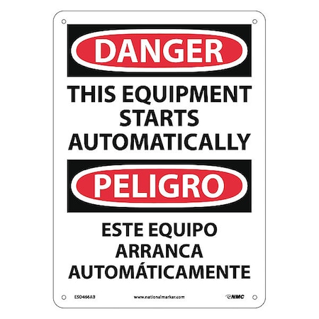 NMC ESD466AB Bilingual OSHA Sign, Legend "DANGER - THIS EQUIPMENT STARTS AUTOMATICALLY", 10" Length x 14" Height, 0.040 Aluminum, Black/Red on White