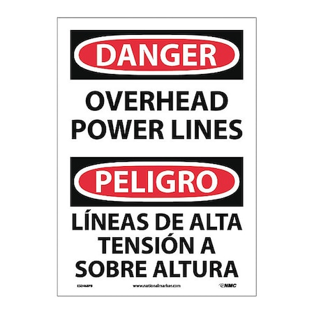 NMC ESD468PB Bilingual OSHA Sign, Legend "DANGER - OVERHEAD POWER LINES", 10" Length x 14" Height, Pressure Sensitive Vinyl, Black/Red on White
