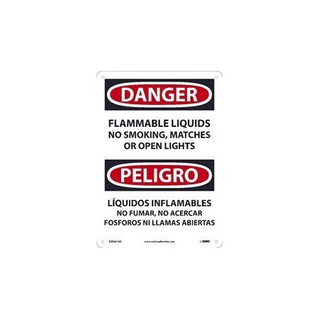 NMC ESD661RB Bilingual OSHA Sign, Legend "DANGER - FLAMMABLE LIQUIDS NO SMOKING, MATCHES OR OPEN LIGHTS", 10" Length x 14" Height, Rigid Plastic, Black/Red on White