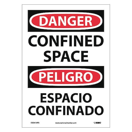 NMC ESD670PB Bilingual OSHA Sign, Legend "DANGER - CONFINED SPACE", 10" Length x 14" Height, Pressure Sensitive Adhesive Vinyl, Black/Red on White