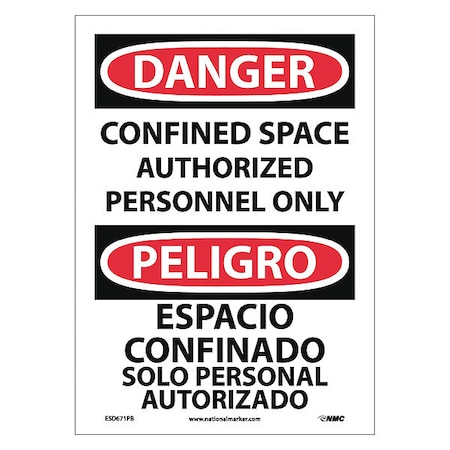 NMC ESD671PB Bilingual OSHA Sign, Legend "DANGER - CONFINED SPACE AUTHORIZED PERSONNEL ONLY", 10" Length x 14" Height, Pressure Sensitive Adhesive Vinyl, Black/Red on White
