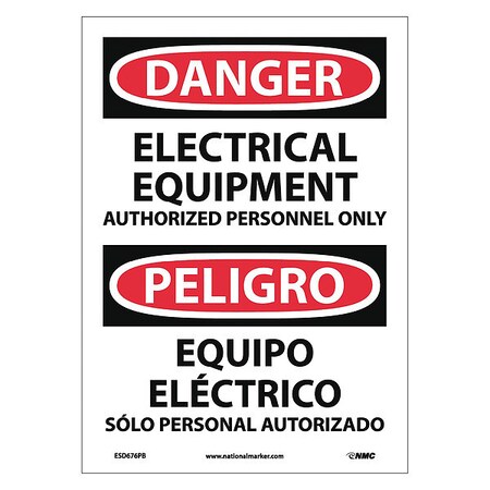 NMC ESD676PB Bilingual OSHA Sign, Legend "DANGER - ELECTRICAL EQUIPMENT AUTHORIZED PERSONNEL ONLY", 10" Length x 14" Height, Pressure Sensitive Adhesive Vinyl, Black/Red on White