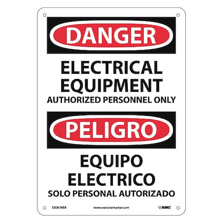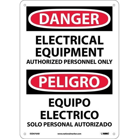 NMC ESD676RB Bilingual OSHA Sign, Legend "DANGER - ELECTRICAL EQUIPMENT AUTHORIZED PERSONNEL ONLY", 10" Length x 14" Height, Rigid Plastic, Black/Red on White