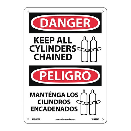 NMC ESD683RB Bilingual OSHA Sign, Legend "DANGER - KEEP ALL CYLINDERS CHAINED" with Graphic, 10" Length x 14" Height, Rigid Plastic, Black/Red on White