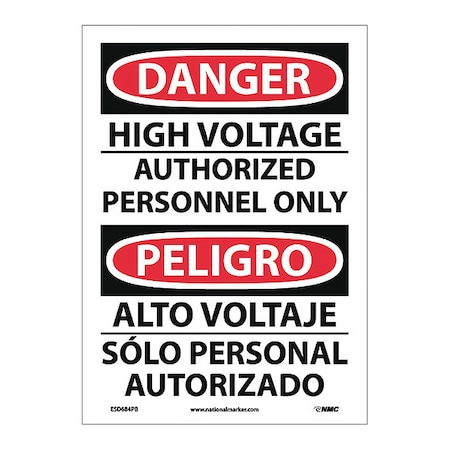 NMC ESD684PB Bilingual OSHA Sign, Legend "DANGER - HIGH VOLTAGE AUTHORIZED PERSONNEL ONLY", 10" Length x 14" Height, Pressure Sensitive Adhesive Vinyl, Black/Red on White