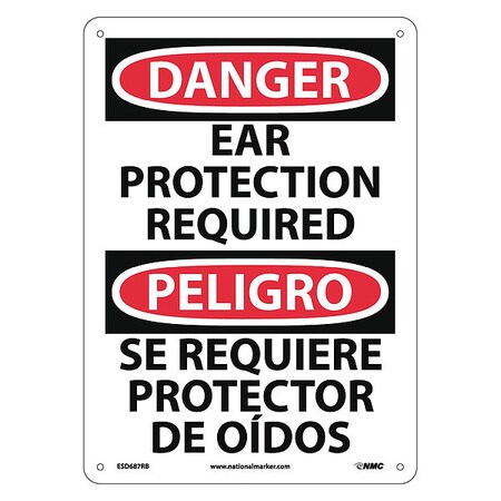 NMC ESD687RB Bilingual OSHA Sign, Legend "DANGER - EAR PROTECTION REQUIRED", 10" Length x 14" Height, Rigid Plastic, Black/Red on White
