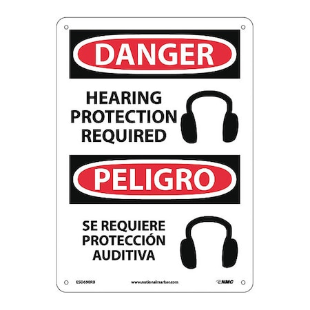 NMC ESD690RB Bilingual OSHA Sign, Legend "DANGER - HEARING PROTECTION REQUIRED" with Graphic, 10" Length x 14" Height, Rigid Plastic, Black/Red on White