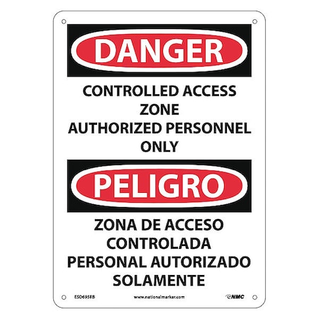 NMC ESD695RB Bilingual OSHA Sign, Legend "DANGER - CONTROLLED ACCESS ZONE AUTHORIZED PERSONNEL ONLY", 10" Length x 14" Height, Rigid Plastic, Black/Red on White