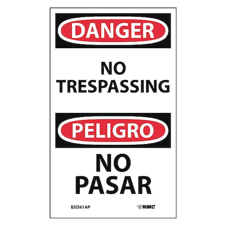 NMC ESD81AP Bilingual OSHA Sign, Legend "DANGER - NO TRESPASSING", 3" Length x 5" Height, Pressure Sensitive Adhesive Vinyl, Black/Red on White (Pack of 5)