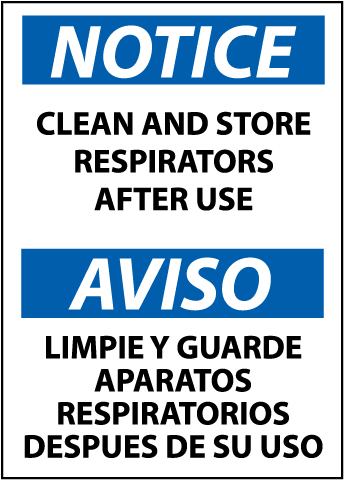 NMC ESN123PC Bilingual OSHA Sign, Legend "NOTICE - CLEAN AND STORE RESPIRATORS AFTER USE", 14" Length x 20" Height, Pressure Sensitive Adhesive Vinyl, Black/Blue on White