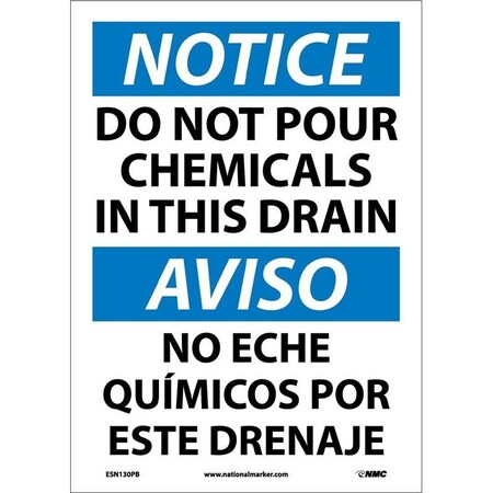 NMC ESN130PB Bilingual OSHA Sign, Legend "NOTICE - DO NOT POUR CHEMICALS IN THIS DRAIN", 14" Length x 10" Height, Pressure Sensitive Adhesive Vinyl, Black/Blue on White