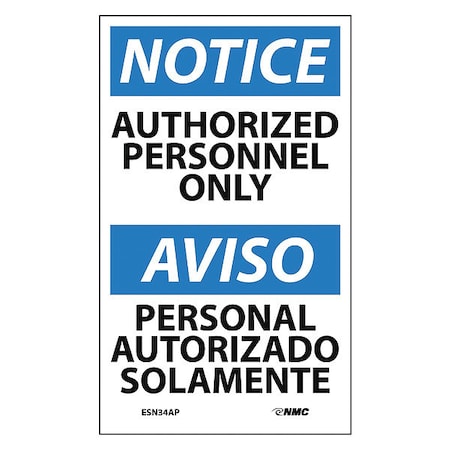 NMC ESN34AP Bilingual OSHA Sign, Legend "NOTICE - AUTHORIZED PERSONNEL ONLY", 3" Length x 5" Height, Pressure Sensitive Adhesive Vinyl, Black/Blue on White (Pack of 5)