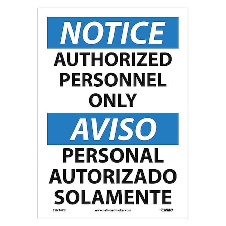 NMC ESN34PB Bilingual OSHA Sign, Legend "NOTICE - AUTHORIZED PERSONNEL ONLY", 14" Length x 10" Height, Pressure Sensitive Adhesive Vinyl, Black/Blue on White