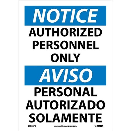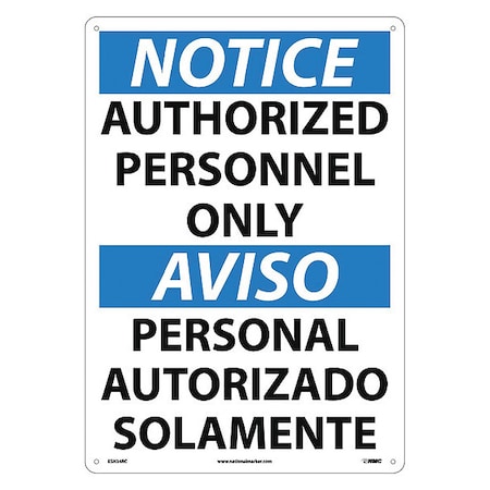 NMC ESN34RC Bilingual OSHA Sign, Legend "NOTICE - AUTHORIZED PERSONNEL ONLY", 14" Length x 20" Height, Rigid Plastic, Black/Blue on White