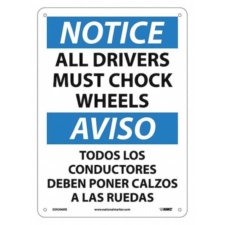NMC ESN366RB Bilingual OSHA Sign, Legend "NOTICE - ALL DRIVERS MUST CHOCK WHEELS", 14" Length x 10" Height, Rigid Plastic, Black/Blue on White