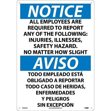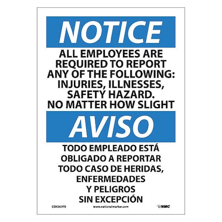 NMC ESN367PB Bilingual OSHA Sign, Legend "NOTICE - ALL EMPLOYEES ARE REQUIRED TO REPORT ANY OF THE FOLLOWING:..., 14" Length x 10 Height, Pressure Sensitive Adhesive Vinyl, Black/Blue on White