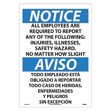NMC ESN367PC Bilingual OSHA Sign, Legend "NOTICE - ALL EMPLOYEES ARE REQUIRED TO REPORT ANY OF THE FOLLOWING:..., 14" Length x 20" Height, Pressure Sensitive Adhesive Vinyl, Black/Blue on White