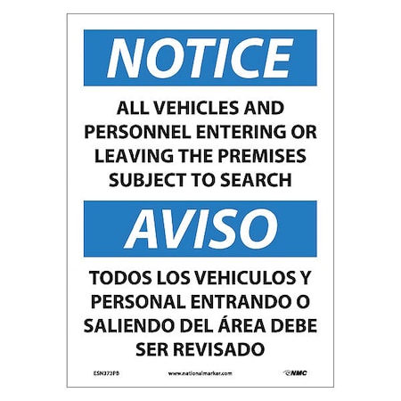 NMC ESN373PB Bilingual OSHA Sign, Legend "NOTICE - ALL VEHICLES AND PERSONNEL ENTERING OR LEAVING THE PREMISES...", 14" Length x 10" Height, Pressure Sensitive Adhesive Vinyl, Black/Blue on White