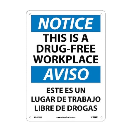 NMC ESN376AB Bilingual OSHA Sign, Legend "NOTICE - THIS IS A DRUG-FREE WORKPLACE", 14" Length x 10" Height, 0.040 Aluminum, Black/Blue on White