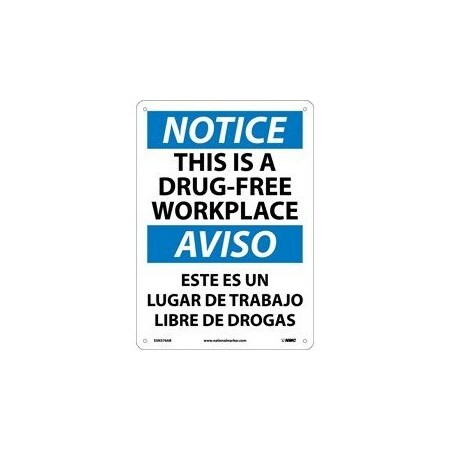 NMC ESN376RB Bilingual OSHA Sign, Legend "NOTICE - THIS IS A DRUG-FREE WORKPLACE", 14" Length x 10" Height, Rigid Plastic, Black/Blue on White