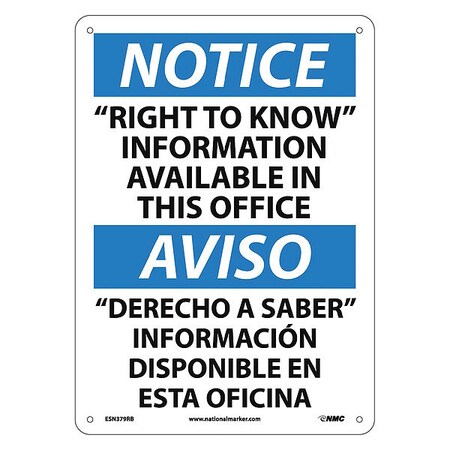 NMC ESN379RB Bilingual OSHA Sign, Legend "NOTICE - "RIGHT TO KNOW" INFORMATION AVAILABLE IN THIS OFFICE", 14" Length x 10" Height, Rigid Plastic, Black/Blue on White