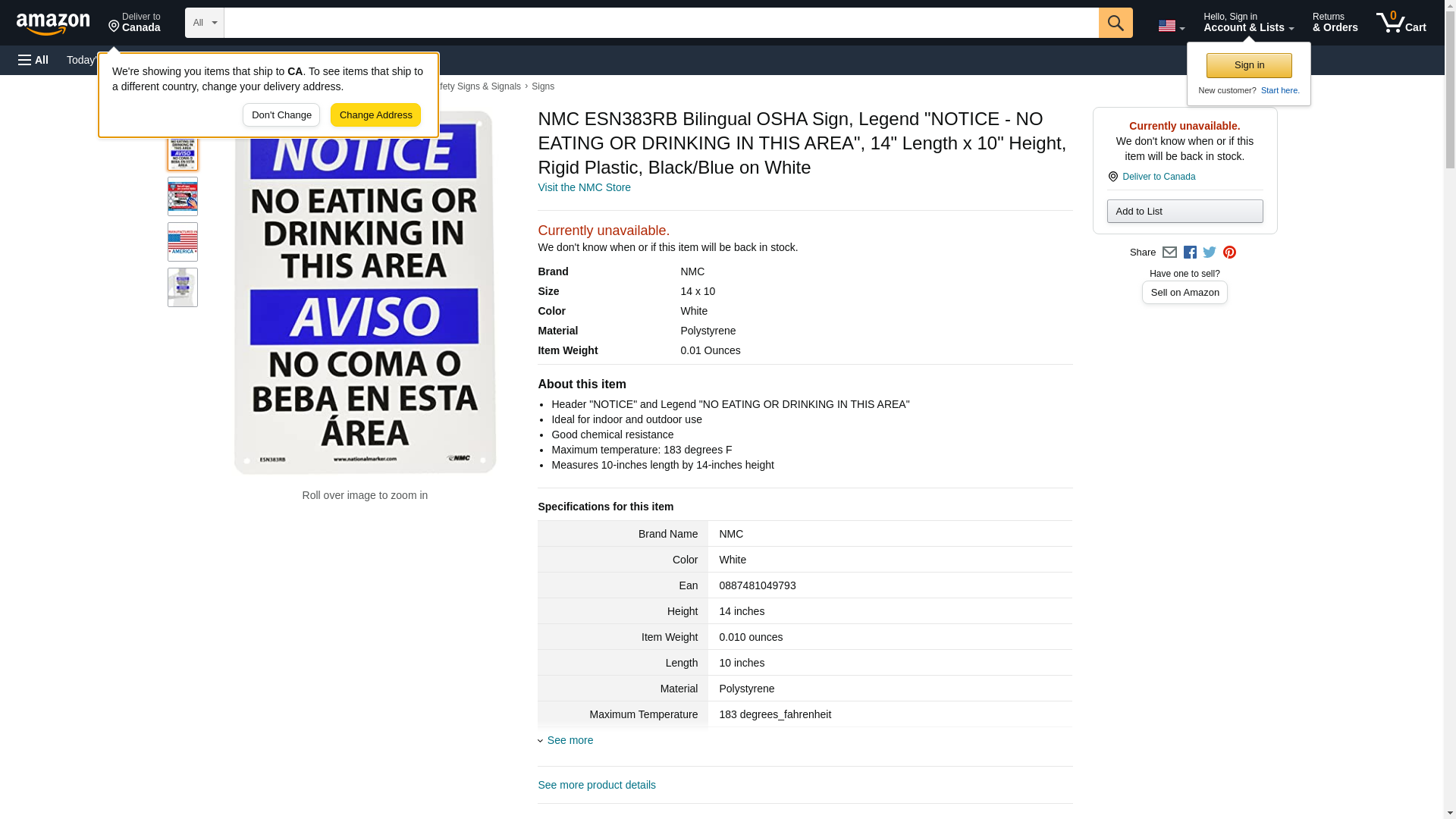 NMC ESN383RB Bilingual OSHA Sign, Legend "NOTICE - NO EATING OR DRINKING IN THIS AREA", 14" Length x 10" Height, Rigid Plastic, Black/Blue on White