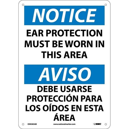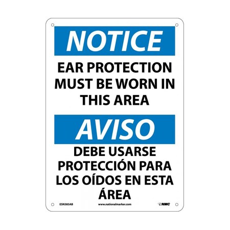NMC ESN385AB Bilingual OSHA Sign, Legend "NOTICE - EAR PROTECTION MUST BE WORN IN THIS AREA", 14" Length x 10" Height, 0.040 Aluminum, Black/Blue on White