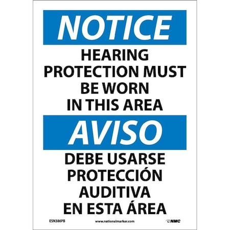 NMC ESN386PB Bilingual OSHA Sign, Legend "NOTICE - HEARING PROTECTION MUST BE WORN IN THIS AREA", 14" Length x 10" Height, Pressure Sensitive Adhesive Vinyl, Black/Blue on White