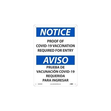NMC ESN540AB Notice Proof of COVID-19 Vaccination Required for Entry, English Spanish, 10 X 14 Sign, Aluminum