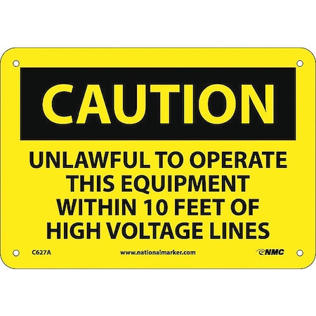 NMC C627A OSHA Sign, Legend "CAUTION - UNLAWFUL TO OPERATE THIS EQUIPMENT WITHIN 10 FT OF HIGH VOLTAGE LINES", 10" Length x 7" Height, Aluminum, Black on Yellow
