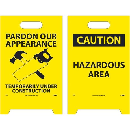 NMC FS23 Double Sided Floor Sign, Legend "PARDON OUR APPEARANCE TEMPORARILY UNDER CONSTRUCTION CAUTION HAZARDOUS AREA" with Graphic, 12" Length x 20" Height, Coroplast, Black on Yellow