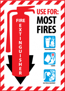 - High Visibility: the sign has the legend “FIRE EXTINGUISHER” in clear, bold letters along with a down arrow graphic and pictures of types of fire for which the fire extinguisher can be used. It is visible in most lighting conditions