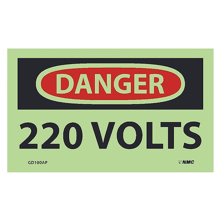 NMC GD100AP OSHA Sign, Legend "DANGER - 220 VOLTS", 5" Length x 3" Height, Glow Polyester, Black/Red on Pale goldenrod (Pack of 5)