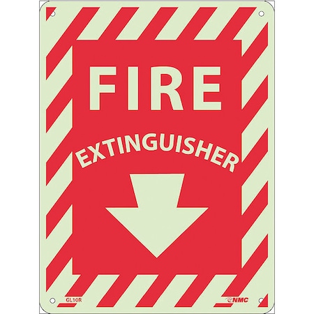 NMC GL10R FIRE EXTINGUISHER Sign - 9 in. x 12 in. Glow Plastic Fire Safety Sign with Arrow, Glow Yellow on Red