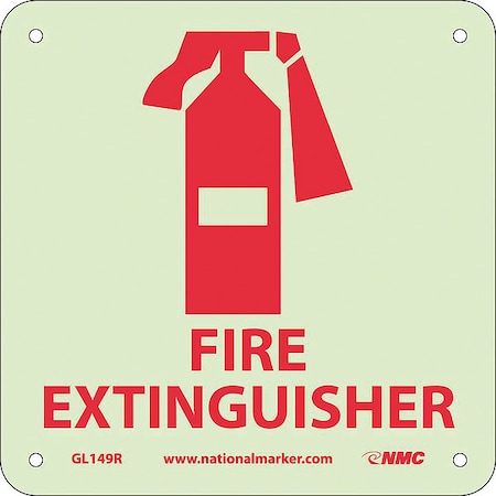 NMC GL149R Fire Sign, Legend "FIRE EXTINGUISHER" with Graphic, 7" Length x 7" Height, Glow Rigid, Red on White