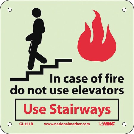 NMC GL151R Graphic See Sign, Legend "In Case of Fire Do Not Use Elevators Use Stairways", 7" Length x 7" Height, Glow Rigid, Black/Red on White