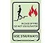 - Specifications: the rectangular vinyl sign measures is 7 in. wide, 10 in. high, and 0.010 in. thick. The sign has black text on yellow base with fire graphic and a man climbing down the stairs. It is suitable to be placed across the commercial sites, buildings and corridors