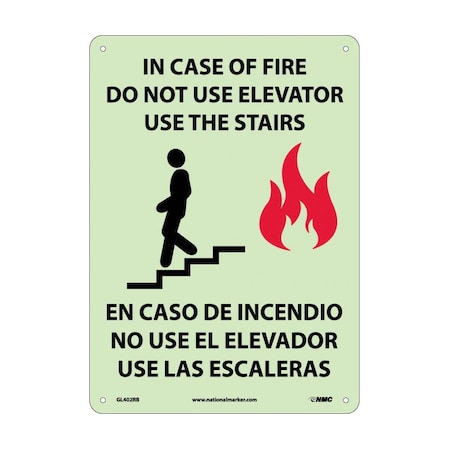 NMC GL402PB Bilingual Fire Sign, Legend "IN CASE OF FIRE DO NOT USE ELEVATOR USE THE STAIRS" with Graphic, 10" Length x 14" Height, Glow Polyester, Red/Black on White
