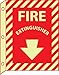 - Product Specification: the rectangular glow plastic sign has red text and graphic on glow yellow. The sign is 0.050 in. thick, 9 in. wide, and 12 in. high. The down arrow graphic makes it easier to identify the location of the extinguisher