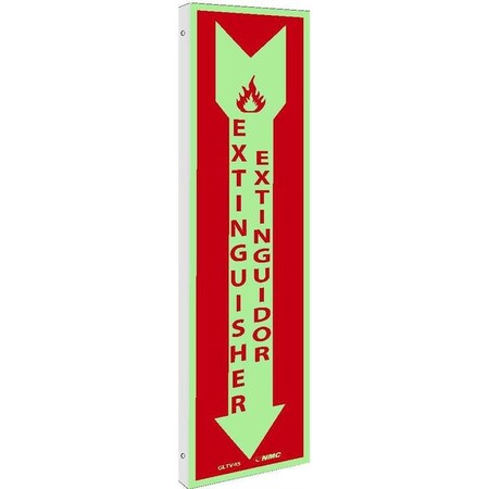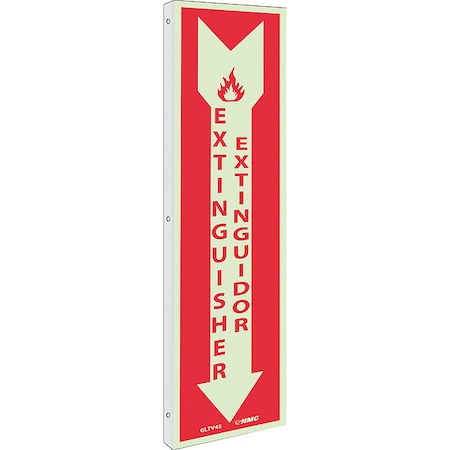 NMC GLTV45 Bilingual flange Sign, Legend "EXTINGUISHER" with Down Arrow Graphic, 4" Length x 18" Height, Glow Rigid, Red on White