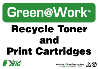 NMC - National Marker Company RECYCLE TONER AND PRINT CARTRIDGES, 7X10, RECYCLE PLASTIC Green @ Work Green @ Work signs are made from high quality, post consumer recycled plastic. Use these recycled plastic signs to promote green thinking and good house keeping in your facility or office.