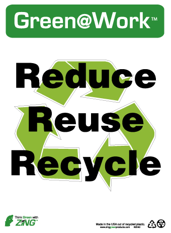 NMC - National Marker Company REDUCE REUSE RECYCLE, 14x10, RECYCLE PLASTIC Green @ Work Green @ Work signs are made from high quality, post consumer recycled plastic. Use these recycled plastic signs to promote green thinking and good house keeping in your facility or office.