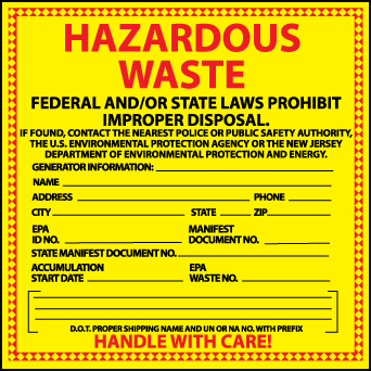 NMC - National Marker Company LABELS, HAZARDOUS WASTE NEW JERSEY, 6X6, PS VINYL Hazardous Waste Container Labels Identify the contents of Hazardous Waste containers with the proper labels.