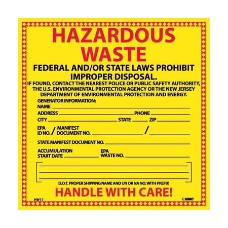 NMC Label "Hazardous Waste New Jersey" HW17. ✅NMC authorized distributor ✅. ☎ (800) 884-5767 Mon-Fri 8:00 AM - 5:00 PM ET or order online 24/7